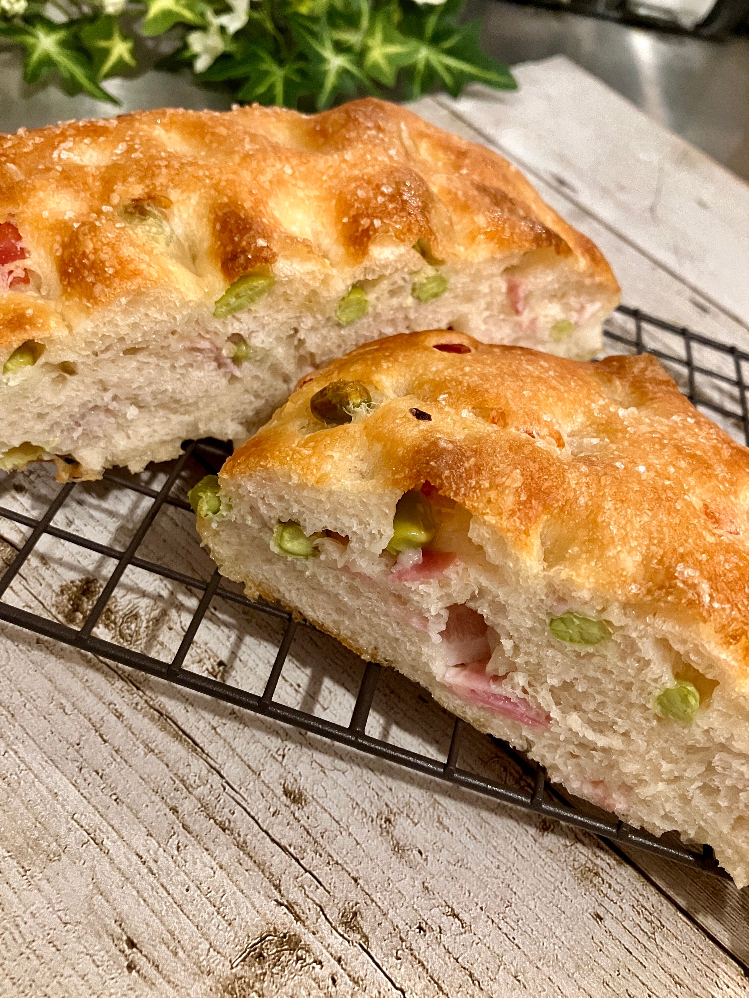 【新しい食の楽しみ方、枝豆とベーコンのフォカッチャ!】